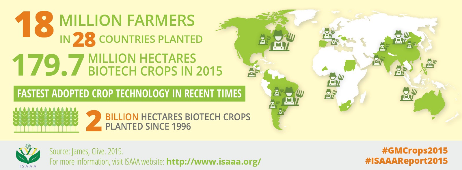 Certes les principales cultures GM, en surface, sont le soja (92,1 millions d'hectares en 2015, soit 83 % de la surface totale), le maïs (53,6 millions d'hectares – quasiment la superficie totale de la France – 29 %), le cotonnier (24 millions d'hectares, 78 %) et le colza (canola – 8,5 millions d'hectares, 24 %).