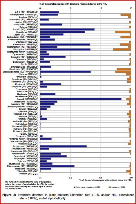 L'Autorité Européenne de Sécurité des Aliments (EFSA) vient de publier son rapport annuel sur les résidus de pesticides dans l'alimentation. Il s'agit de la compilation et de l'analyse des mesures effectuées par les autorités nationales des 28 États membres de l'Union européenne ainsi que de l'Islande et de la Norvège dans le cadre de deux programmes : des programmes nationaux de contrôle dont on peut dire qu'ils présentent un biais vers les situations à risque, et un programme européen coordonné.