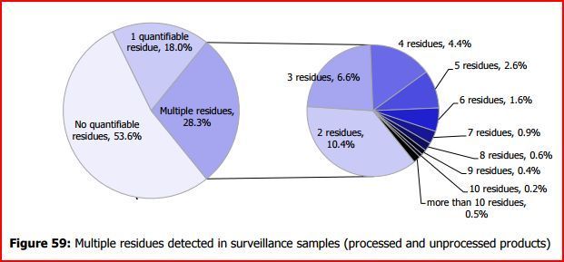 La présence de plusieurs résidus n'est pas anormale et ne témoigne en aucune manière d'une « main lourde » de la part des producteurs. Il peut s'agir de résidus de traitements contre des ravageurs différents (il ne sert à rien de protéger une culture contre une maladie si c'est pour qu'elle soit dévorée par un insecte...), ou contre un même ravageur mais avec des produits différents pour lutter aussi contre l'installation d'une résistance ; ou encore de mélanges de lots au stade de la transformation, de produits utilisés pour la conservation, d'absorption de polluants persistants, de dérives de traitements...
