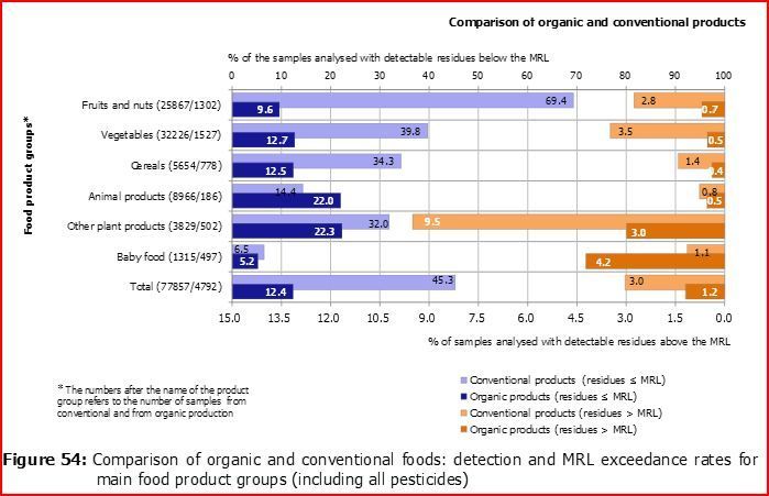 Les 98,8 % de produits biologiques se situant dans les limites légales se décomposent en 86,4 % sans résidus et 12,4 % avec résidus dans les limites légales. Le consommateur qui s'inquiète de sa santé et choisit en conséquence les produits bio améliore donc ses chances de moitié, en gros, de manger un produit sans résidu ; il réduit de 2,9 % à 1,2 % son risque de manger un produit dépassant la LMR (dans le cas des fruits et légumes pour des prix respectivement 67 % et 78 % plus élevés que les prix du conventionnel selon les relevés effectués par l'Association Familles Rurales en 2016).