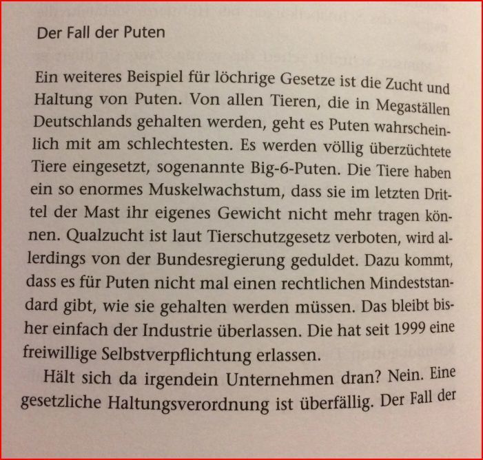 Aujourd'hui, c'est l'ouvrage de M. Hofreiter « Fleischfabrik Deutschland » (l'usine de viande de l'Allemagne) qui servira à nouveau de base. Pour M. Hofreiter, président du groupe parlementaire Bündnis 90/die Grünen (Alliance 90/Les Verts), il faut moins d'une page de livre pour expliquer pourquoi l'élevage de dindes est si atroce (p 160) :