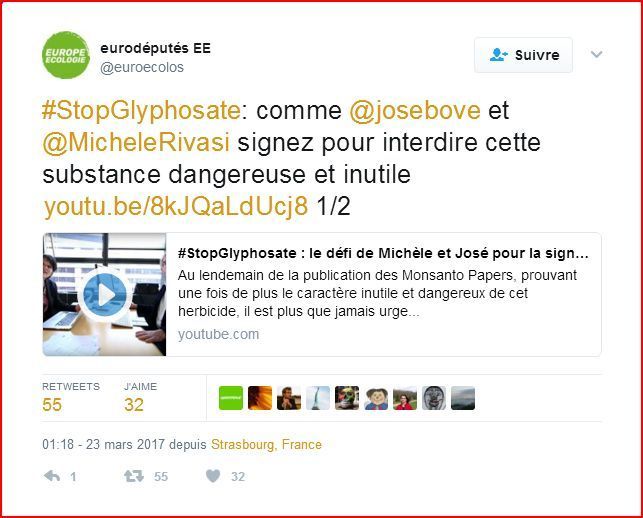 « Au lendemain de la publication des Monsanto Papers, prouvant une fois de plus le caractère inutile et dangereux de cet herbicide, il est plus que jamais urgent de faire interdire le glyphosate. Une interdiction que nous avons, par ailleurs, réclamée dans une lettre à la Commission européenne, écrite à notre initiative mais cosignée par des eurodéputés de diverses sensibilités politiques. »