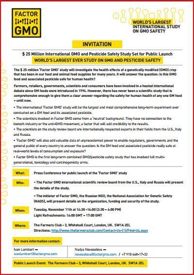 11 novembre 2014 : « Factor GMO » est lancé par une conférence de presse à Londres.