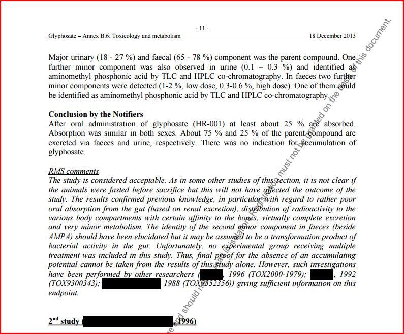 « En raison du grand nombre des études toxicologiques soumises, l’ État rapporteur n’a pas été en mesure de rendre compte en détail des études originales et une approche de substitution a été adoptée. Les descriptions et les évaluations de chaque étude, telles que fournies par la GTF ont été modifiées en supprimant les parties redondantes (telles que les "résumés" [executive summaries] et en renumérotant les tableaux de données. Les erreurs évidentes ont été corrigées. Chaque nouvelle étude a été commentée par l’Etat rapporteur. Ces remarques sont clairement distingues des soumissions originales par un titre, sont toujours en italiques et se trouvent en dessous des résumés individuels d'études.