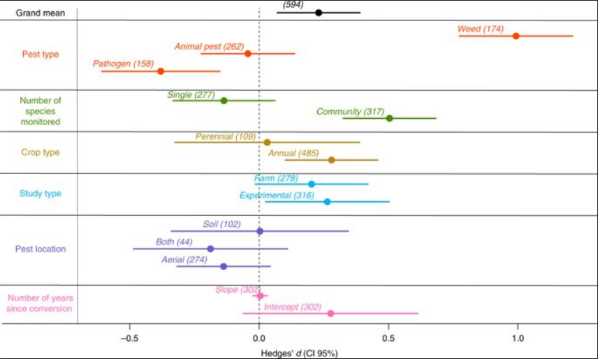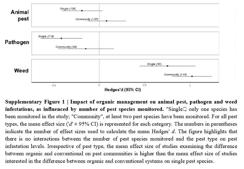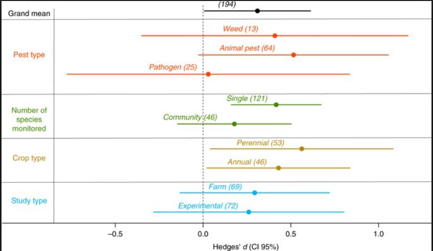 Quoi qu'il en soit, les résultats d'une telle méta-analyse sont fortement dépendants du mix de couples « espèce cultivée-peste ». Nous avons déjà critiqué la méthode à propos de l'impact des OGM ; un des problèmes était dans ce cas le regroupement de données issues de systèmes agricoles très différents.