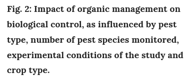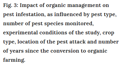 Cette étude apporte des preuves que l'agriculture biologique peut améliorer la lutte antipestes et suggère que l'agriculture biologique offre un moyen de réduire l'utilisation de pesticides de synthèse pour la gestion des pestes animales et des agents pathogènes sans augmenter leurs niveaux d'infestation. »