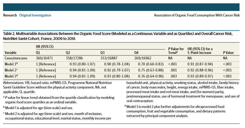 « Dans cette grande étude prospective il y avait peu ou pas de diminution de l'incidence du cancer associée à la consommation de produits biologiques, à l'exception peut-être du lymphome non hodgkinien. »