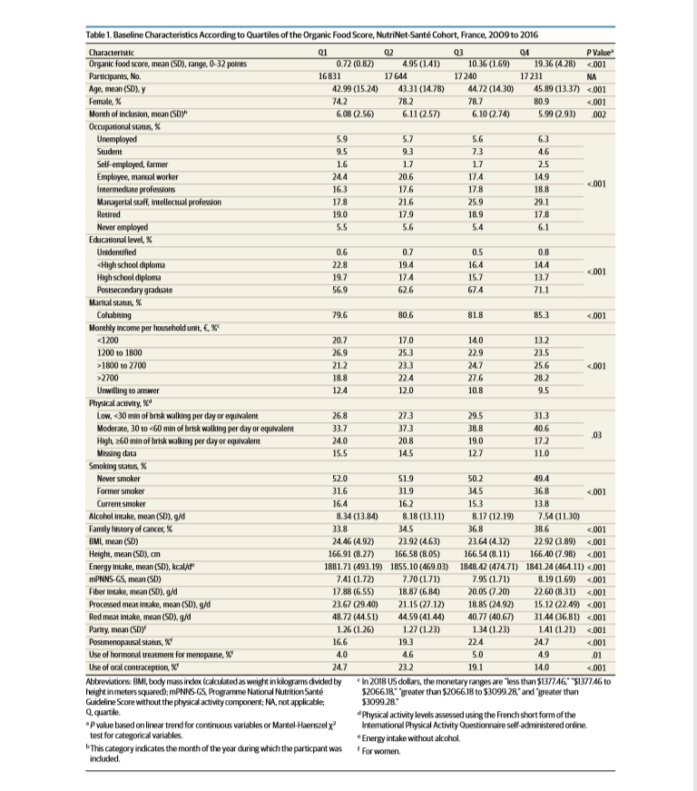 Une équipe de chercheurs de l’INRA, de l'INSERM, de l'Université Paris 13, du CNAM et de quelques autres institutions a publié le 22 octobre 2018 « Association of Frequency of Organic Food Consumption With Cancer Risk – Findings From the NutriNet-Santé Prospective Cohort Study » (association de la fréquence de consommation d'aliments biologiques avec le risque de cancer – résultats de l'étude de cohorte prospective NutriNet-Santé) dans JAMA Internal Medicine (pour lire le texte, l'ascenseur est du côté gauche et si vous voulez le texte en PDF, il faut cliquer une fois sur l'onglet). L'équipe est composée de Julia Baudry, Karen E. Assmann, Mathilde Touvier, Benjamin Allès, Louise Seconda, Paule Latino-Martel, Khaled Ezzedine, Pilar Galan, Serge Hercberg, Denis Lairon et Emmanuelle Kesse-Guyot (dont les noms sont dûment suivis de leurs titres académiques dans la publication... faut c'qui faut dans une revue médicale...).