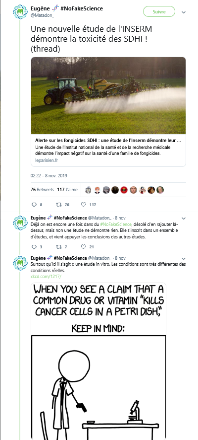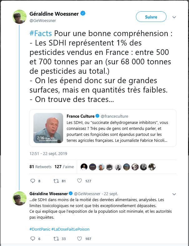 Nous ne nous attarderons pas sur le compte rendu de Mme Émilie Torjemen, du Parisien, « Alerte sur les fongicides SDHI : une étude de l’Inserm démontre leur toxicité », équilibré et informatif. Sauf à relever qu'il n'a pas fait l'objet de commentaires, malgré un titre est démesurément alarmiste.