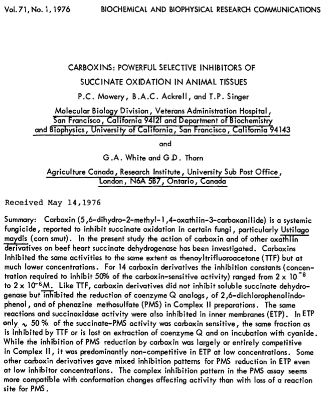« 16. Mowery PC, Ackrell BA, Singer TP Carboxins: powerful selective inhibitors of succinate oxidation in animal tissues. Biochem Biophys Res Commun 1976;71:354-61. »