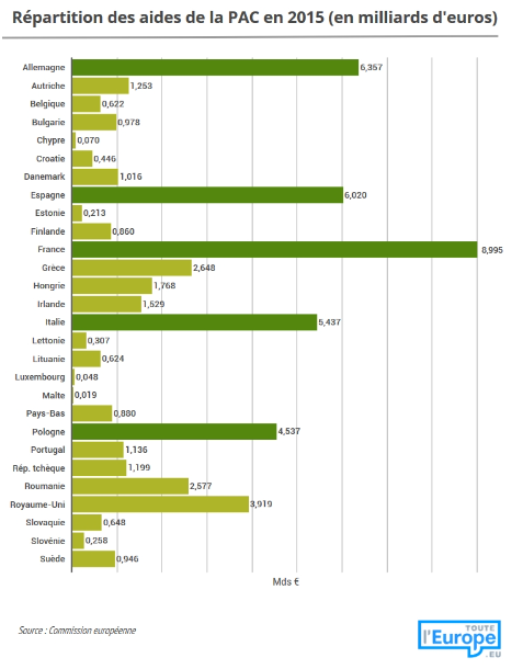 En effet, la France perçoit près de 9 milliards d'euros au titre des aides (le plus gros montant de l'Union Européenne, en relation avec l'importance de son agriculture). Cela représente la gigantesque (ironie) somme de 134 euros par habitant et par an... ou 37 centimes d'euro par jour. Les aides PAC sont une source d'hystérie dans notre société, et même les agriculteurs/trices se laissent prendre.