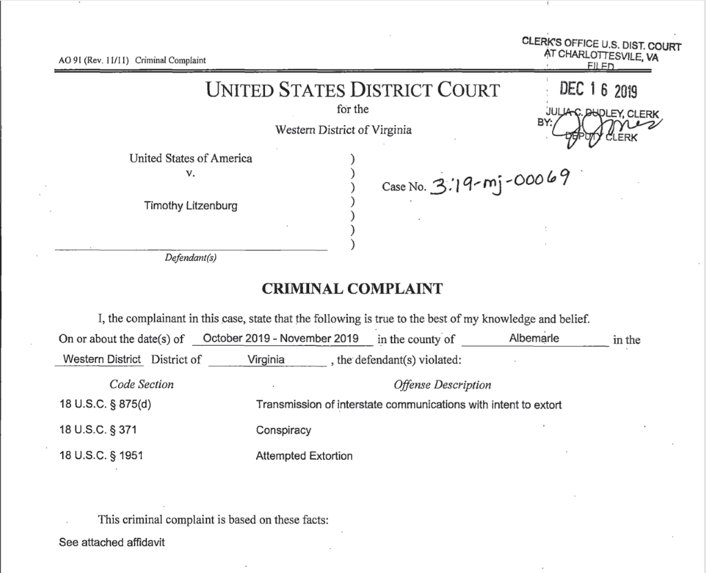 Timothy Litzenburg, 37 ans, de Charlottesville, en Virginie, a été accusé dans une plainte pénale ouverte aujourd'hui d'avoir transmis des communications interétatiques avec l'intention d'extorquer, de tenter d'extorquer et de comploter en vue de commettre une extorsion et de transmettre des communications interétatiques avec l'intention d'extorquer.