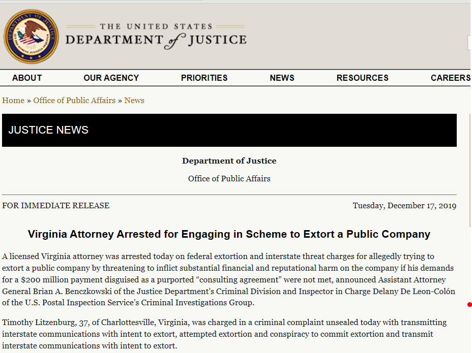 Un avocat inscrit au barreau de Virginie a été arrêté aujourd'hui [17 décembre 2019] pour extorsion fédérale et menaces interétatiques au motif qu'il aurait tenté d'extorquer de l'argent à une société publique en menaçant d'infliger des dommages financiers et de réputation substantiels à la société si ses demandes de paiement de 200 millions de dollars camouflés en un prétendu « accord de consultance » n'étaient pas satisfaites, ont annoncé le procureur général adjoint Brian A. Benczkowski de la Division Pénale du Département de la Justice et l'inspecteur en charge Delany De Leon-Colón du Groupe des Enquêtes Criminelles du US Postal Inspection Service.