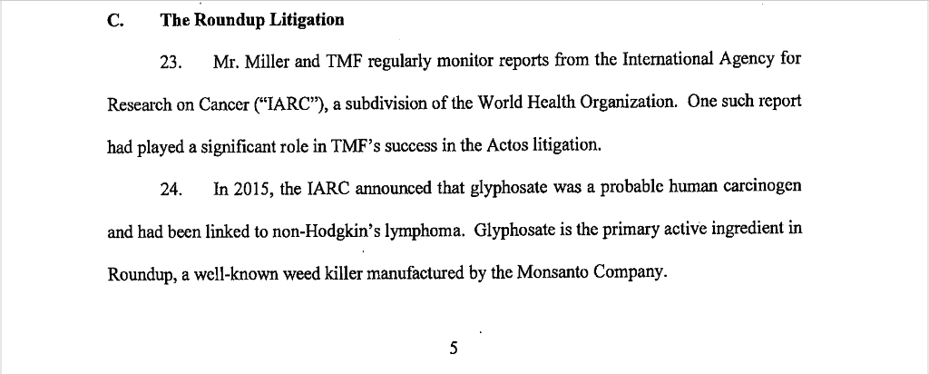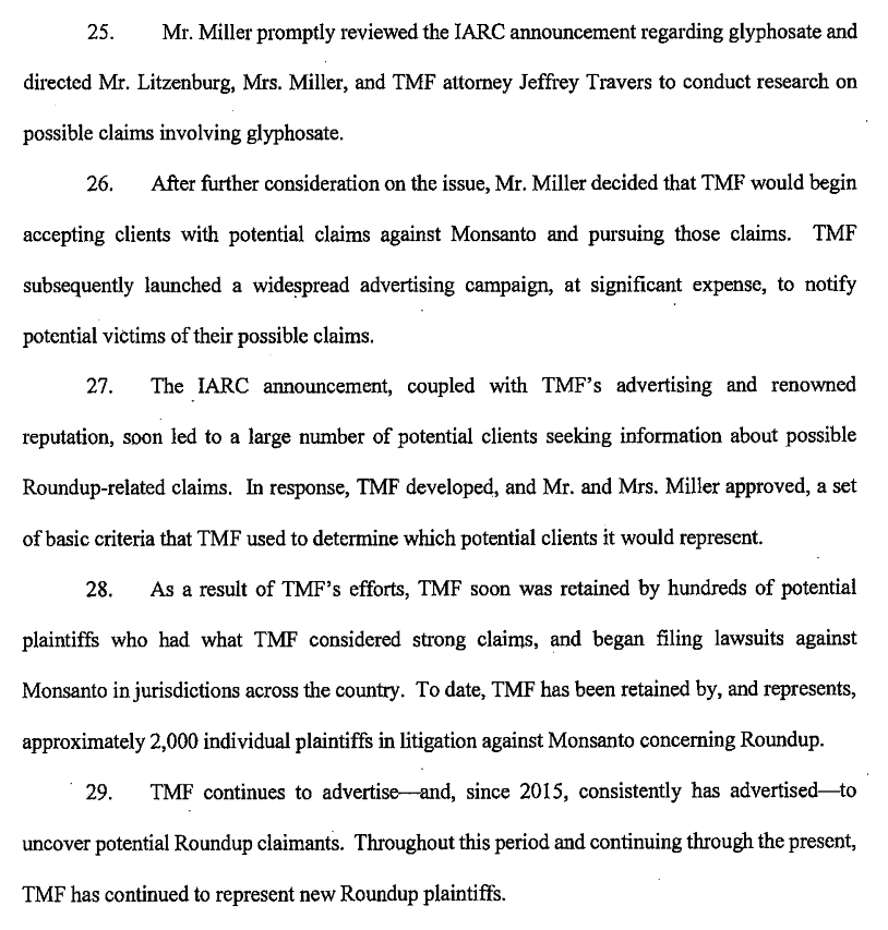 Qui peut croire que M. Litzenburg et d'autres membres de la Miller Firm LLC n'ont pas employé des moyens de même nature, en tout cas discutables, dans leur tentative de faire les poches de Bayer/Monsanto ?