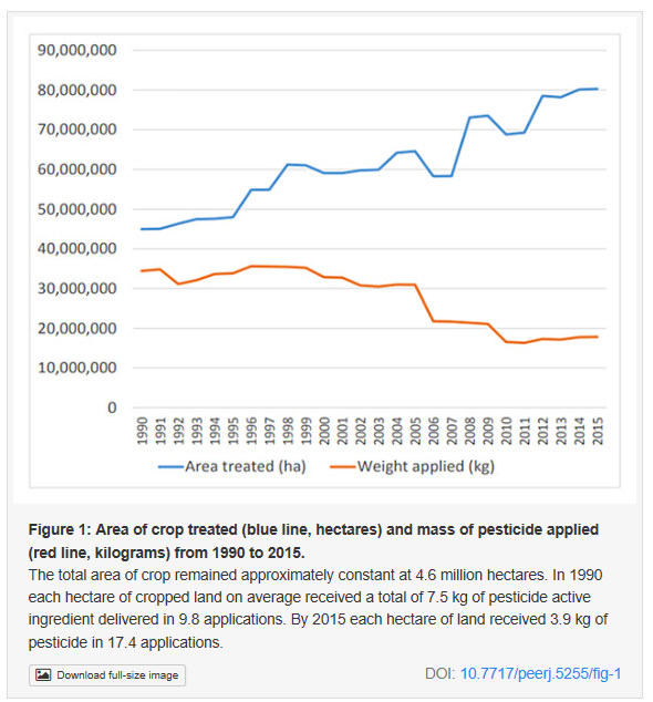 Mais dans la publication qu'il cite et dont il est l'un des co-auteurs, il est rapporté qu'entre 1990 et 2015, l'utilisation de pesticides a diminué de 48 % en masse, passant de 34,4 à 17,8 milliers de tonnes. Selon leurs calculs et leur méthodologie, en 1990, chaque hectare recevait 7,5 kg de substance active en 9,8 applications ; en 2015, c'étaient 3,9 kg en 17,4 applications. Des éléments passés sous silence dans ce commentaire qui s'attache à « démontrer » que tout est de la faute de l'irresponsable industrie agrochimique :