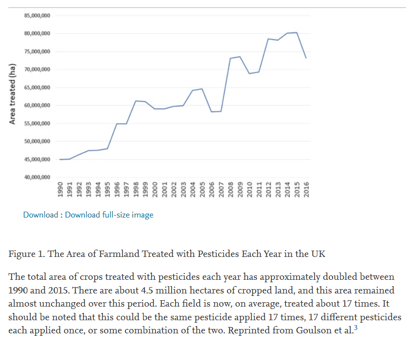 Et à la guerre, comme à la guerre ! Dans sa figure 1, M. Dave Goulson prétend que chaque hectare de terre arable (cropped land) est traité en moyenne 17 fois, c'est-à-dire traité 17 fois avec le même pesticide, ou une fois avec 17 substances, ou une combinaison des deux. Admettons.