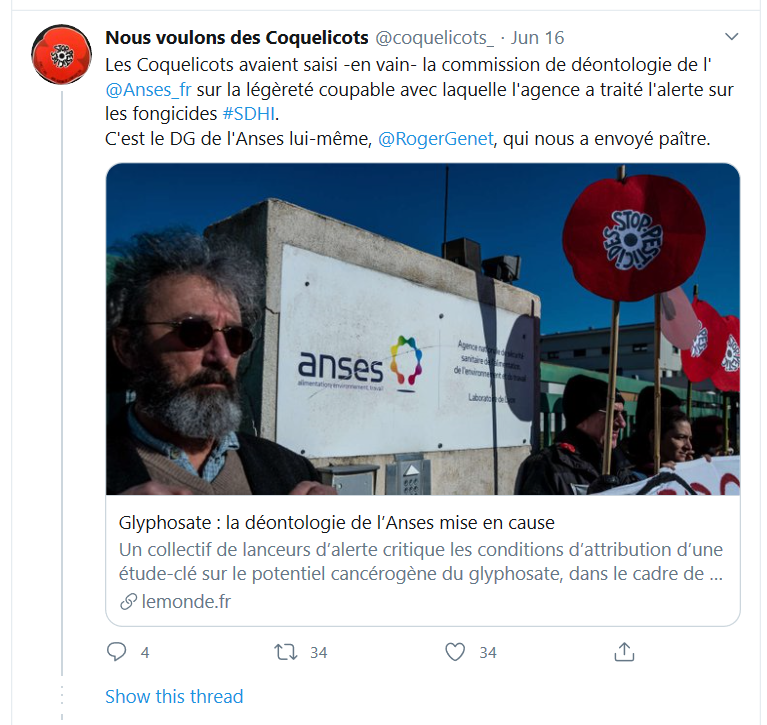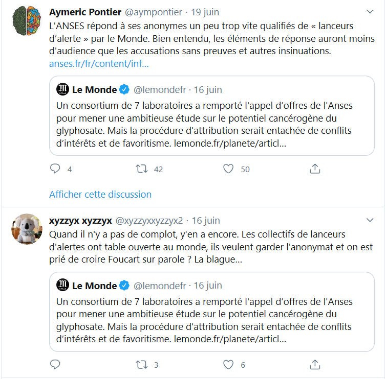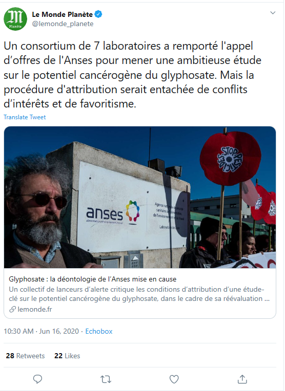 Le 16 juin 2020, sous la signature du duo Stéphane Foucart-Stéphane Horel, le Monde a publié « Glyphosate : la déontologie de l’Anses mise en cause », avec en chapô :
