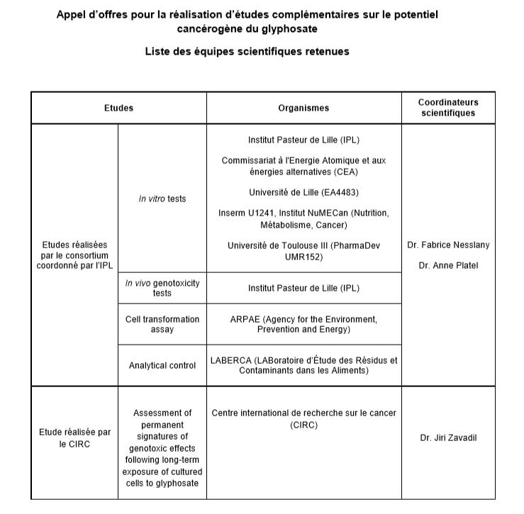 Le 30 avril 2020, l'ANSES publiait les résultats d'un appel d'offres dans « Etude du potentiel cancérogène du glyphosate : l’Anses annonce la sélection des équipes scientifiques retenues pour conduire les études toxicologiques complémentaires ». Elle a écrit :