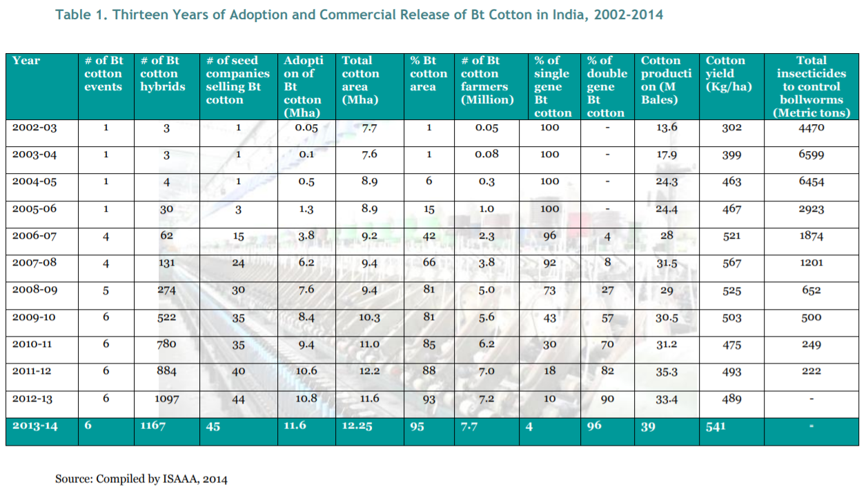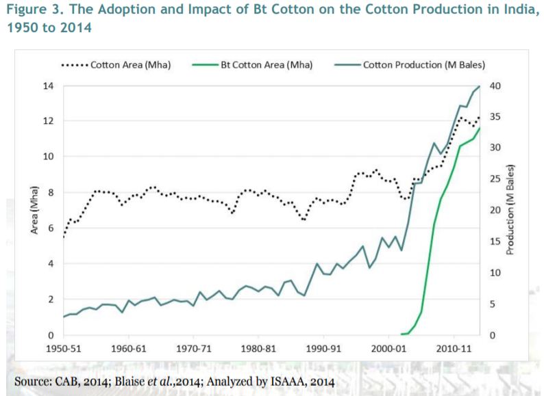 « L'augmentation phénoménale de la production de coton est attribuée à l'adoption à grande échelle du cotonnier Bt, le cotonnier à gène Bt unique de 2002 à 2006 et le cotonnier à deux gènes Bt à partir de 2006, par les petits producteurs de coton dans les dix États producteurs de coton. En 2014, 7,7 millions de cotonculteurs ont adopté le cotonnier Bt, ce qui représente 95 % des 12,25 millions de cotonculteurs estimés en Inde [sic, il s'agirait plutôt de la surface]. Ces dernières années, les agriculteurs ont augmenté la densité de plantation du cotonnier, en particulier dans les zones irriguées et semi-irriguées qui ont conduit à une augmentation substantielle de la productivité du cotonnier par hectare dans toutes les régions. [...] »