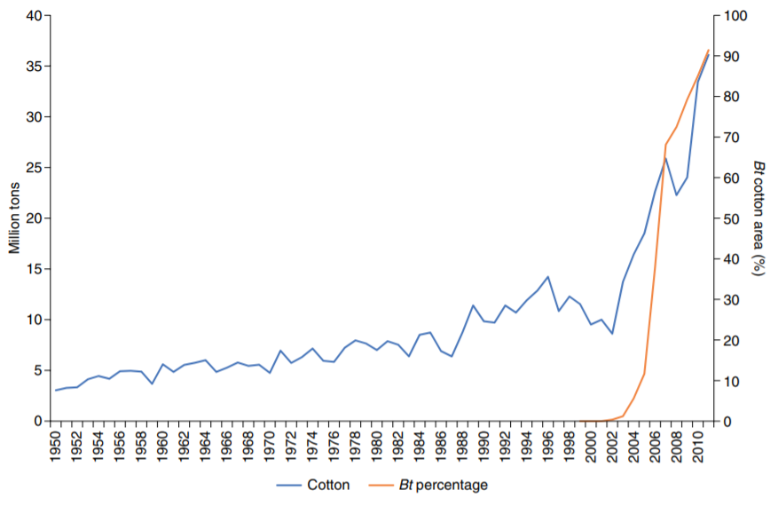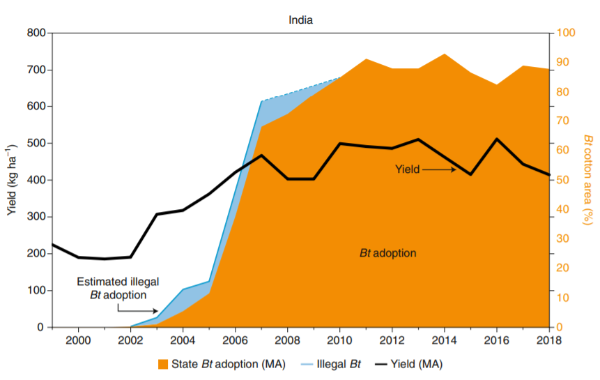 « Les résultats montrent que le cotonnier Bt a contribué pour 19 % à la croissance totale du rendement au fil du temps, soit entre 0,3 % et 0,4 % de chaque point de pourcentage d'adoption chaque année depuis son introduction. Outre le cotonnier Bt, l'utilisation d'engrais et l'adoption accrue de semences hybrides semblent avoir contribué à l'augmentation des rendements au fil du temps. Cependant, si l'adoption officielle du cotonnier Bt a contribué à l'augmentation du rendement après 2005, le cotonnier Bt non officiel pourrait également avoir participé à l'augmentation des rendements observée à partir de 2002, année de sa introduction en Inde. »